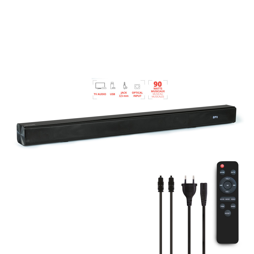 La barre de son est devenue un élément essentiel de tout système audio domestique moderne, offrant une expérience sonore immersive pour les films, la musique et les jeux vidéo. Avec une puissance musicale totale de 90 W, cette barre de son délivre un son clair et puissant qui remplit facilement votre espace de vie avec une qualité audio optimale. Grâce à sa connectivité Bluetooth® 5.3, vous pouvez diffuser sans fil votre musique préférée depuis nimporte quel appareil compatible Bluetooth, offrant ainsi une liberté totale de mouvement. Dotée dune entrée TV Audio, dune entrée USB pour la lecture de fichiers MP3, dune entrée AUX 3,5 mm ainsi quune entrée optique, cette barre de son offre une compatibilité étendue avec une variété dappareils, y compris les téléviseurs, les lecteurs Blu-ray et les consoles de jeux. De plus, son design élégant et compact sintègre parfaitement dans nimporte quel décor de salon, offrant une solution audio discrète et esthétique.