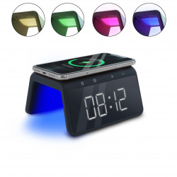 Un réveil à la fois tendance et pratique avec ses 8 couleurs vives d'éclairage, sa simulation d'aube et sa charge induction de 15W pour votre smartphone. Oubliez les matins difficiles, le modèle Midnight s'occupe de tout et vous offre une expérience d'éveil incomparable. Avec son large panel de 7 mélodies et sons de la nature, de 4 volumes sonores et surtout sa fonction d'éclairage progressif 10 min avant le réveil, vous commencerez assurément la journée de bon pied. Intelligent, l'éclairage de l'écran suit votre rythme quotidien pour vous accompagner au mieux : intensité maximale dans la journée, réduite le soir et minimale la nuit pour un sommeil de qualité. Vous chargerez votre smartphone compatible rapidement en induction 15W, directement en le posant sur le réveil. Le port USB-A offre une alternative de recharge filaire pour d'autres appareils.