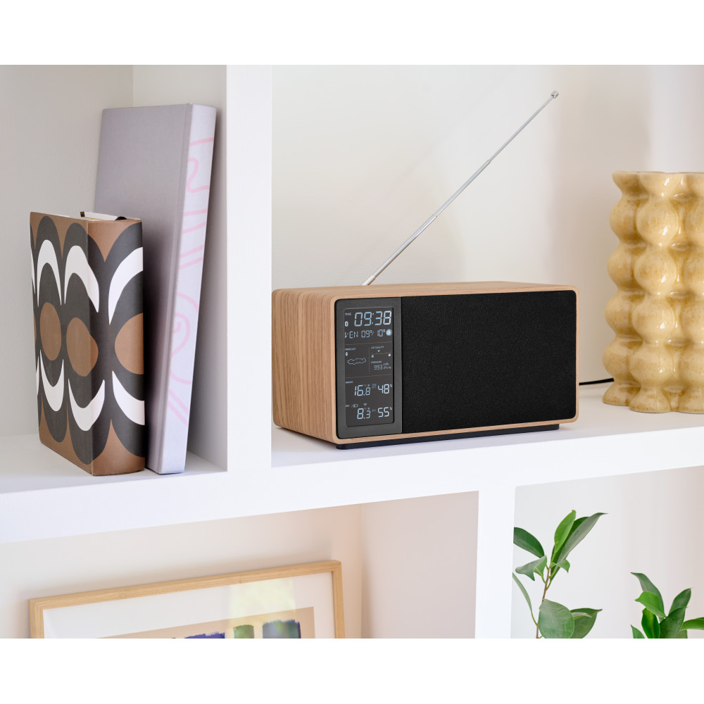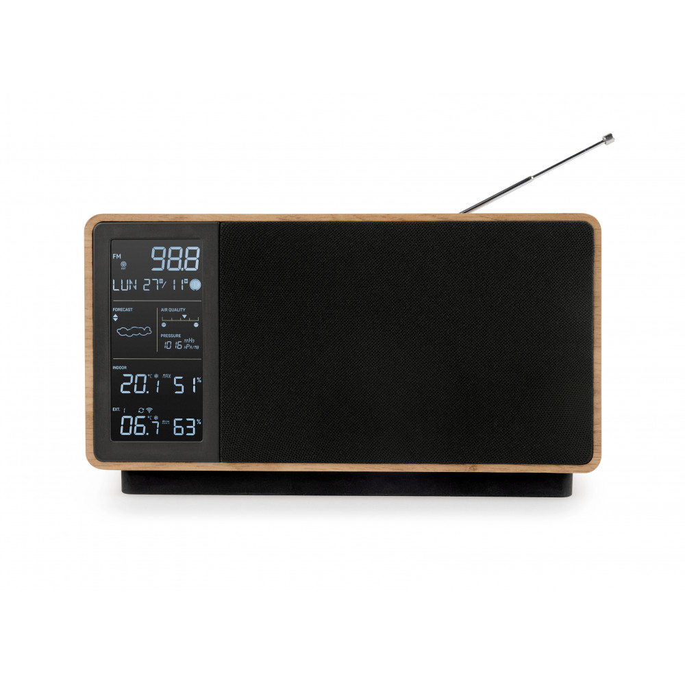 Plus qu'une simple enceinte, elle intègre une station météo complète avec un affichage clair de l'hygrométrie, les phases de la lune, la qualité de l'air, les prévisions météorologiques, les températures intérieure et extérieure, la date et l'heure, la pression atmosphérique. Tout un programme pour commencer une journée informé.