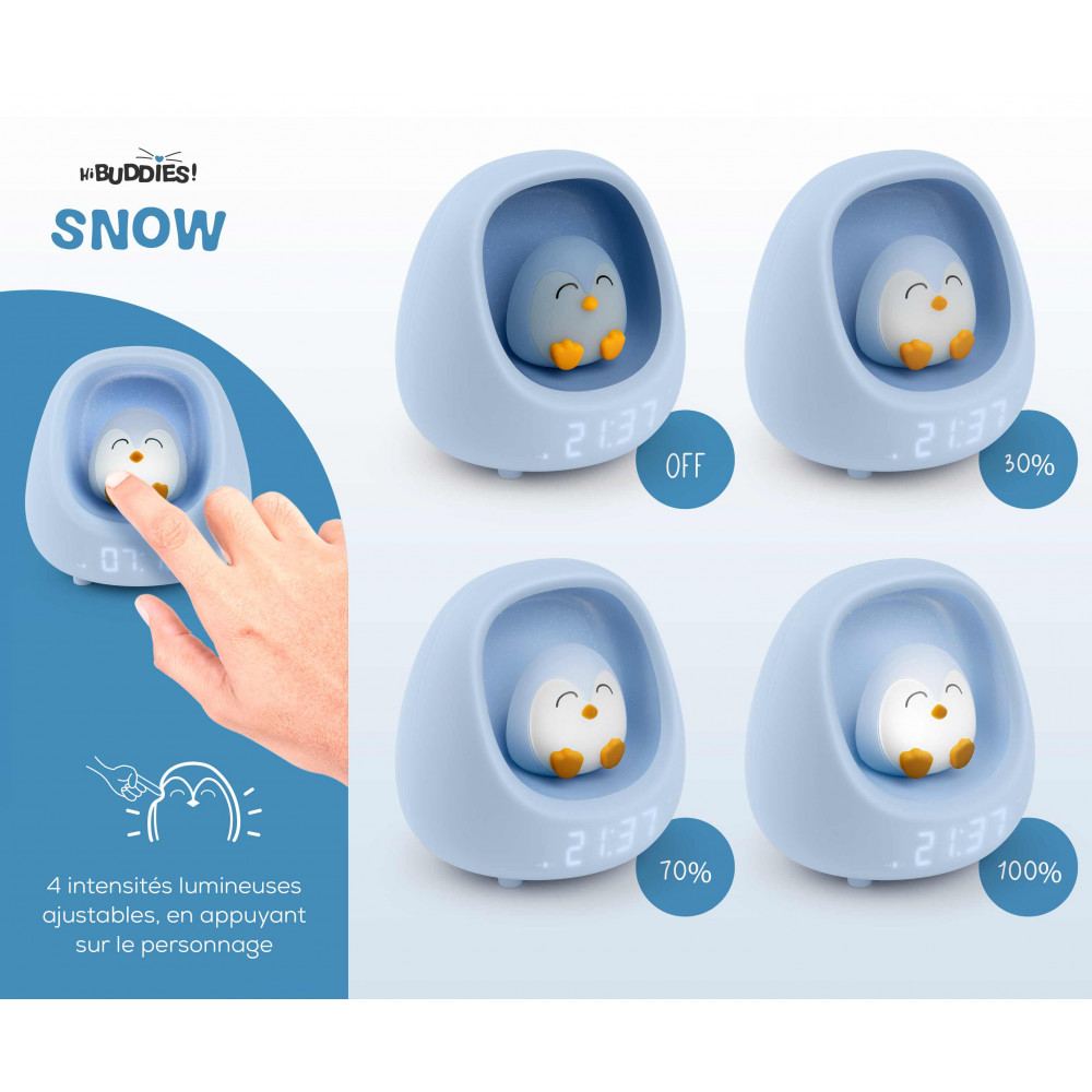 - Avec son design tendre en forme de pingouin, Snow séduit autant les enfants que les parents. Sa prise en main simple aide les plus jeunes à se familiariser avec la gestion de l’heure et à instaurer de bonnes habitudes de sommeil. Pour régler l'intensité de la lumière, il suffit de faire une pression douche sur le pingouin !