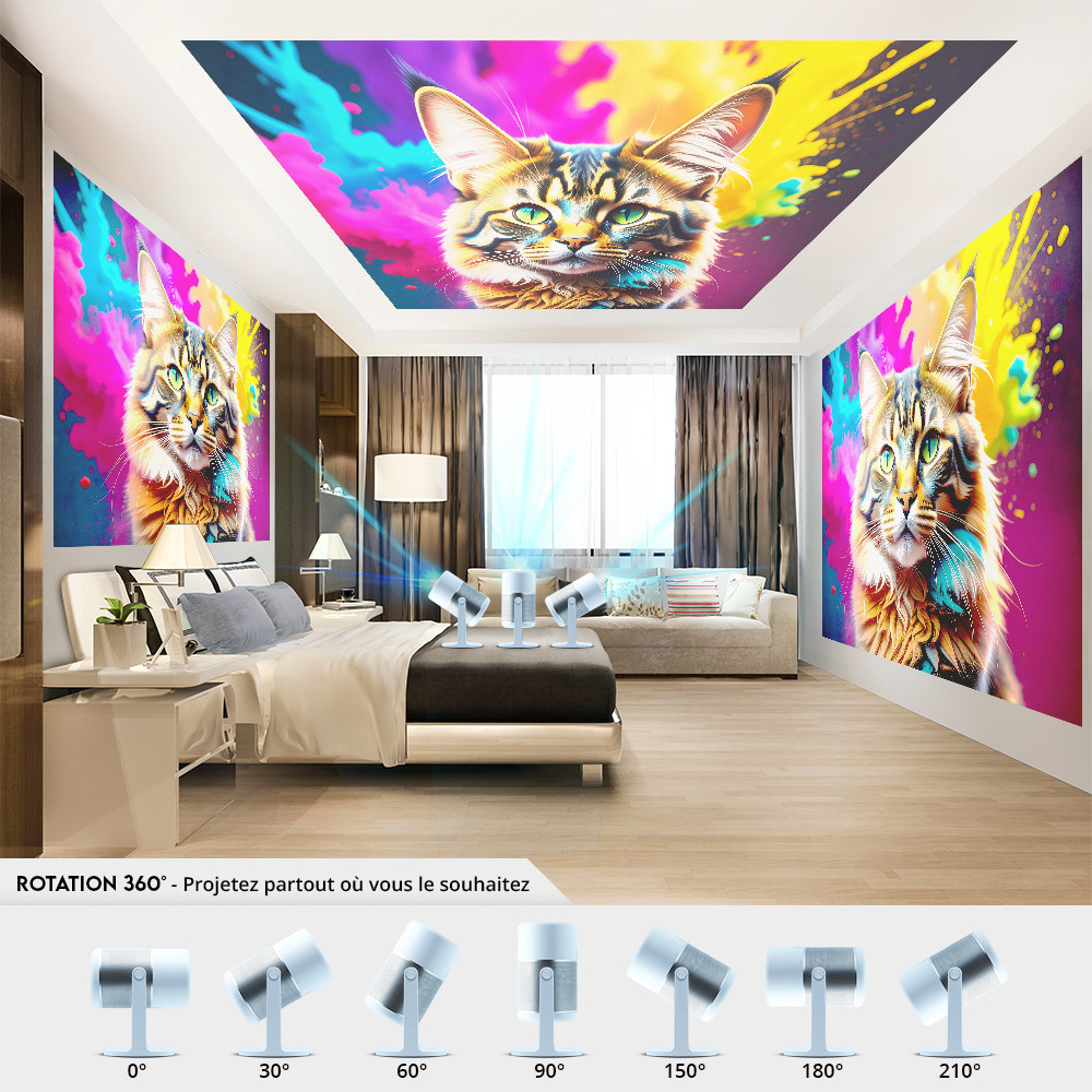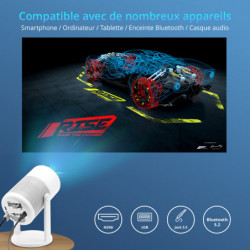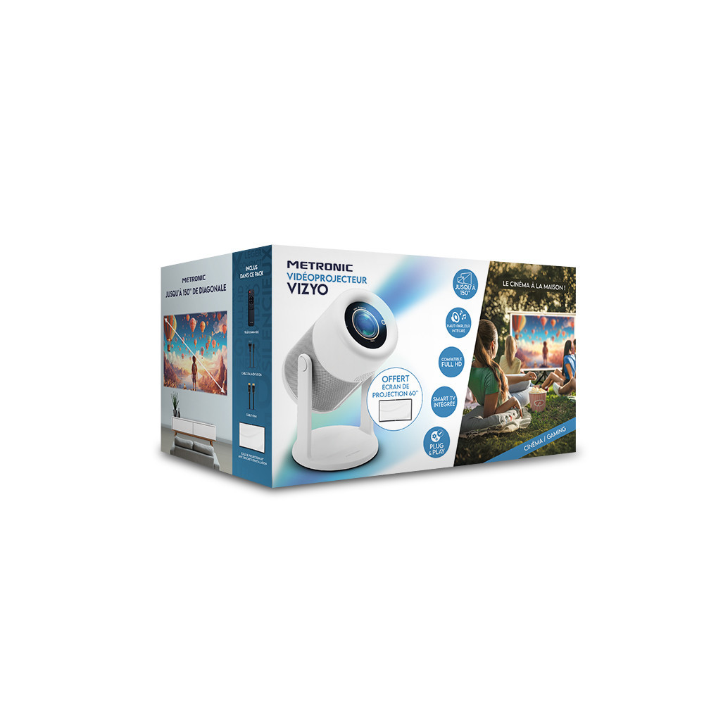 Profitez dune véritable expérience cinéma à la maison grâce à ce vidéoprojecteur compact, compatible Full HD. Son contraste élevé, sa lentille en verre à haute transmittance et sa lampe LED de 60W offrent une image nette, lumineuse et riche en couleurs. Simple à installer grâce à sa mise au point digitale et à sa correction automatique du trapèze, il vous permet daccéder à vos contenus et applications préférés via une connexion Wi-Fi, HDMI ou USB. Silencieux, léger et doté dun haut-parleur intégré, il est parfait pour le cinéma, les jeux ou les présentations, à la maison comme en déplacement. Et pour une immersion encore plus grande, un écran de projection 60 est offert, facile à installer où que vous soyez.